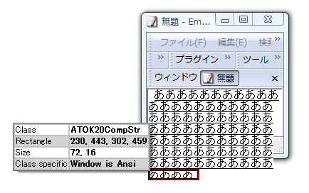 EmEditor 上に ATOK 2007 で入力しているところですが,変換中の文字列 (プリエディット) は実は ATOK 2007 自身によって管理されるウィンドウ (IME 用語では Composition Window) の上に描画されています.(XIM 用語でいうところの Over the Spot 方式)