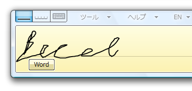Phrase List として,「Word」「Excel」「PowerPoint」という 3 つを与えたテキストボックスをフォーカスし,適当に落書きしてみたときの様子.手書き認識エンジンは,与えられた Phrase の中から候補を選ぶので,何を書いてもどれかが提示される.